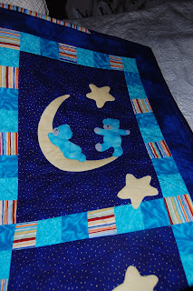 Inte ett enda stygn har jag sytt för hand :) Allt är gjort på symaskinen. Till och med de små ansiktena på nallarna har jag frihandsquiltat.